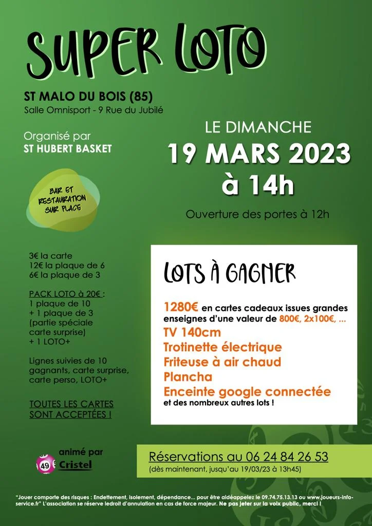 Vous êtes tous invités à venir participer au SUPER LOTO organisé par “ST HUBERT BASKET”, le dimanche 19 mars 2023 à 14h à la salle omnisport de St Malo-du-Bois.