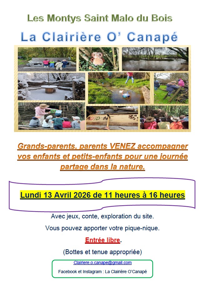 Venez passer un moment agréable à la Clairière O’Canapé, ils vous attendent le lundi 13 avril 2026 de 11h à 16h avec jeux, conte, etc…
