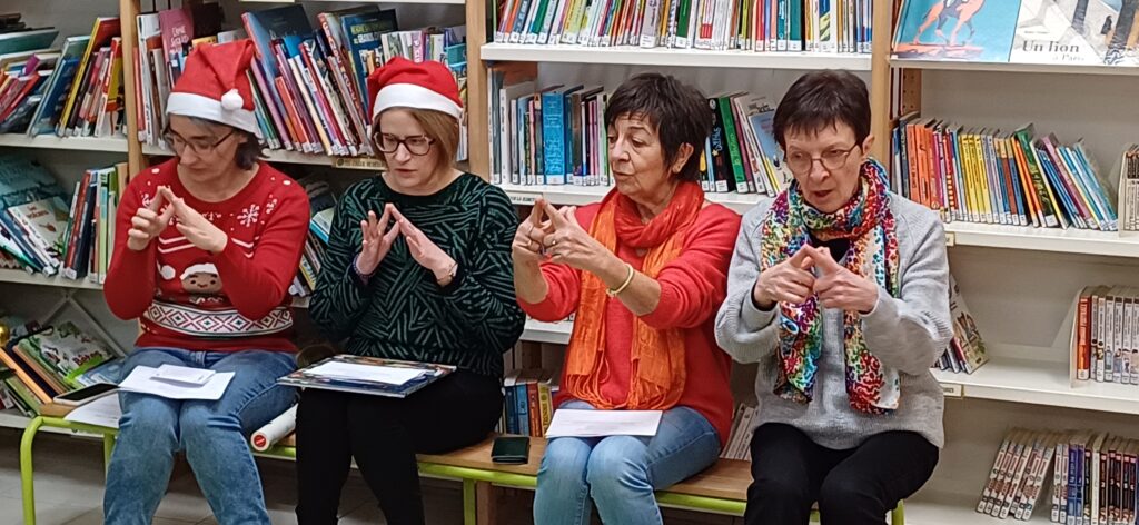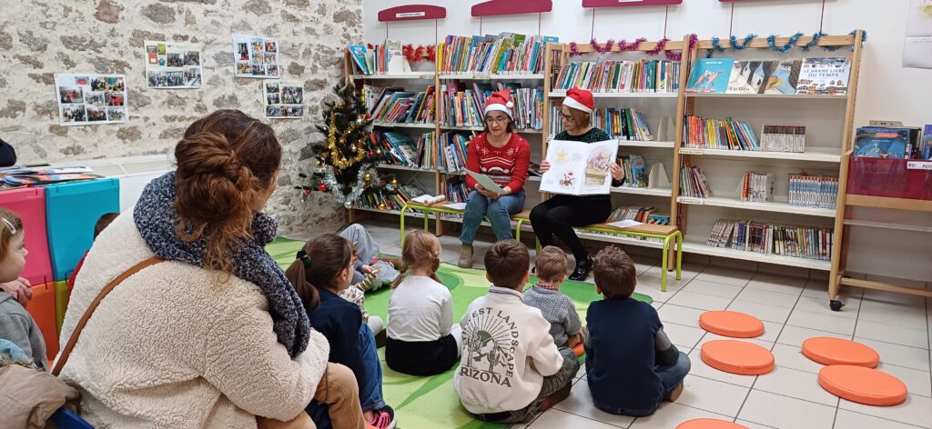 A côté, Françoise, Anne et des membres de la bibliothèque ont accueilli le Père Noël et tous ses lutins pour écouter, découvrir une histoire de Noël.