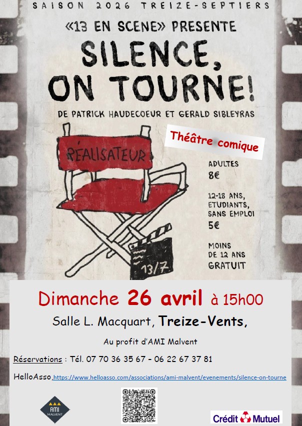 😀 Nous vous attendons nombreux à la pièce de théâtre comique “Silence, on tourne !”, qui sera présentée par la troupe “13 en scène” le dimanche 26 avril à 15h à la salle Lucie Macquart de Treize-Vents, en soutien à notre association.