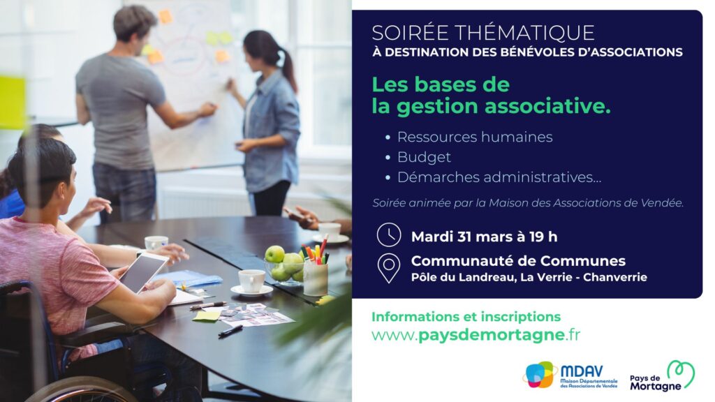 Cette soirée, gratuite, sera animée par la MDAV (Maison Départementale des Associations de Vendée), t’éclairée par le retour d’expérience d’une association locale.