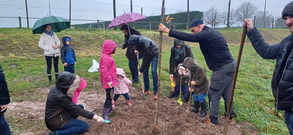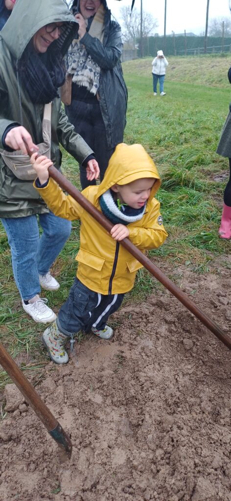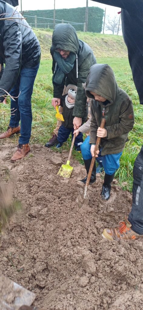 Au préalable, les agents avaient préparé le terrain. Christian a apporté le grand chêne🌳, Christophe, pelle à la main, a conseillé nos jeunes jardiniers👨🌾. La terre était bien grasse, bien collante… Les parents, frères et sœurs, ont également mis la main à la pâte, enfin à la terre…